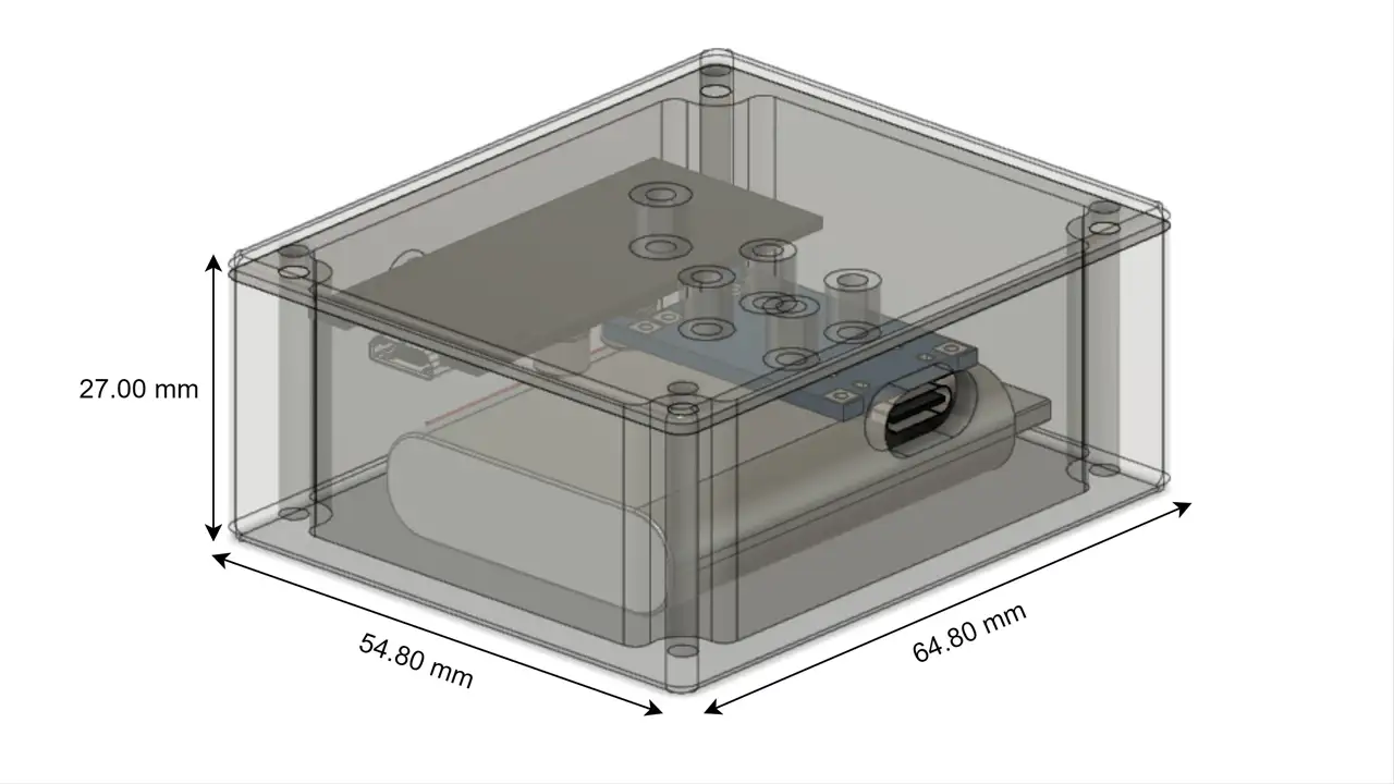 Untuk fabrikasi casing saya menggunakan proses 3D Printing untuk menekan biaya dan untuk memudahkan pengerjaan dari tahapan desain menuju realisasi. Casing saya desain sendiri dengan ukuran relatif kecil 64.80 mm x 54.80 mm x 27.00 mm sehingga cukup kecil dan tidak terlalu besar untuk dibawa ke mana-mana. Untuk meningkatkan kekuatan material, bisa menggunakan material seperti ABS dan PETG agar casing bisa lebih tahan terhadap suhu panas (outdoor).